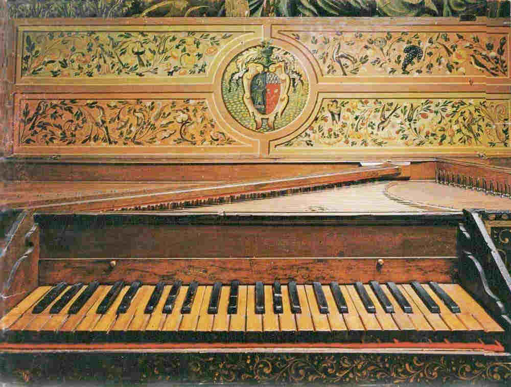 Harpsichord, 1694; made by Nicolaus DeQuoco, Italy One-manual: Range C-c3 (no C♯); 2×8′, 1×4′