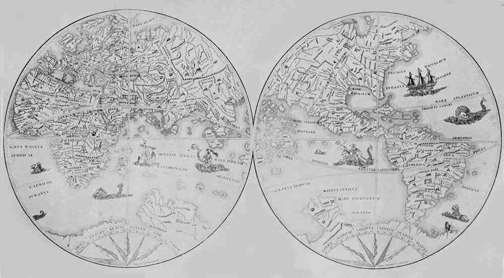 “S. Matheo, an island in the Atlantic, south of the line, was visited by the Spanish ships under Loaysa and Sebastian del Cano, but has never been seen since. It appears on the globe. In the south Atlantic there are painted a sea-serpent, a whale, Orpheus riding on a dolphin, and ships under full sail—fore and main courses and topsails, a sprit sail, and the mizzen with a long lateen yard.