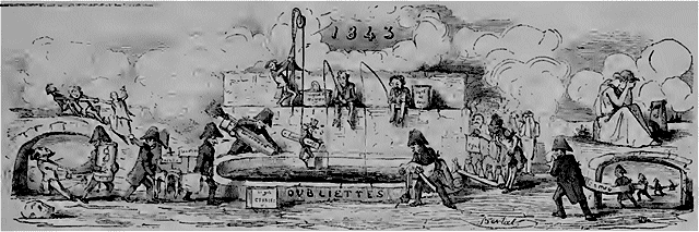 Ouverture de la Session de 1843. Cortège royal; Arrivée du Roi dans la cour du Palais-Bourbon; Discours d'ouverture,--Oraison funèbre de 1843, Neuf Gravures, par Bertal.--Le Jour de l'An en Europe. Un Lever de la reine d'Angleterre; la Bénédiction de la Newa; la Polonaise à la cour de Russie; Baisers du Jour de l'An, par Grandville.--Le Jour de l'An en Chine. Une Carte chinoise.--L'Origine des Étrennes.--Les Petits Bonheurs du Jour de l'An. Le Palais de la Nouvelle Année, par Grandville.--Les Petites Misères du Jour de l'An. Vingt Gravures, par Cham.--Éphémérides du Jour de l'An.--Modes de 1844, par Grandville.--Rébus.