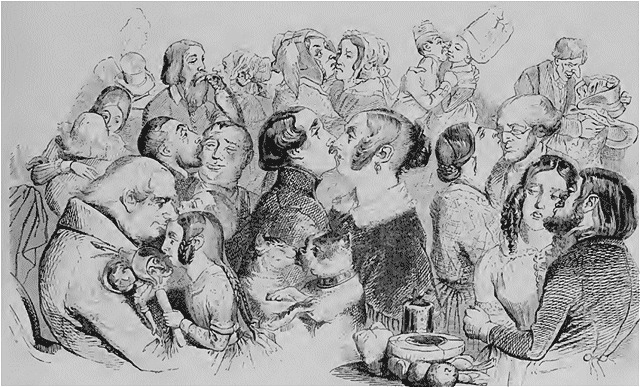 Au lieu donc d'entrer chez les Gougibus, il fait un détour, et se dit: «Eh bien! allons souhaiter la bonne année à ce cher Babylas.» Il entre en effet chez Babylas, qui n'est pas très-bien portant, et le reçoit assis sur une chaise que je ne qualifierai pas. Babylas est marié et père de nombreux enfants: il ne sait pas trop comment cela lui est venu; mais n'importe! il s'en rapporte à madame Babylas. Ces enfants sont nés excessivement caressants: c'est là leur moindre défaut. A peine ont-ils aperçu l'ami de leur père, qu'ils se précipitent dans ses bras pour lui souhaiter la bonne année: c'est une véritable scène d'abordage et de mât de cocagne; jamais le jour de l'an ne manifesta une tendresse plus étouffante; l'un grimpe sur le dos du malheureux, l'autre le prend par le cou; celui-ci se suspend à ses reins, celui-là à sa barbe; et quels baisers! Le célèbre Hercule du Nord n'avait pas plus d'agrément quand il déjeunait avec un fer rouge et quatre poids de cinquante livres sur l'estomac.--Le père Babylas jouit avec attendrissement de ce spectacle domestique: ça le soulage.