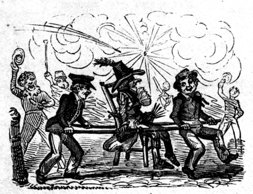 Viz. Pinch a piece out of a man's arm, to say you did not know there was any harm. Break his shin—that's leg-al. Pull away his chair[33] when he is sitting down—you've good ground for it. Run your head against his—two heads are better than one. Overturn the milk-jug on him—then he's in the milky way. So with the urn—then he's in hot water. When he hops about, say he seems in a lame-ntable way. Let the boys knock the candle into some lady's lap—this you may call a wick-ed thing, &c. &c. Intersperse these, with other such amiable pleasantries as these, and all the fools (a commanding majority in every assembly in the country), will shout for joy, extol your wit, and applaud your ingenuity.