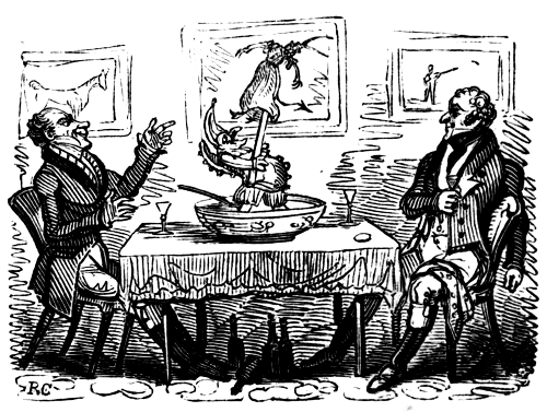 I may with great propriety contend, that under such merry designation, I am addressing a very large portion of the British public. If, beneath your patronage, this little work should prove as[Pg vi] successful as the flattering anticipations of some friendly adepts in the art of punning have induced me to expect, it is my intention to collect and publish, annually, all the choicest Morceaux and Vagaries relating to punning that can be obtained from the wits and witty works of our own times: for which purpose I solicit communications of original Puns and Epigrams, directed to my Publishers. In arranging the present work, I have endeavoured to bring together all that was important to a proper understanding of the Merry Art; to which are annexed examples by the most celebrated Punsters of their day; many of which now, for the first time, appear in print. Illustrated by fourteen original and appropriate designs, from that mirth-inspiring graphic humourist, Robert Cruikshank.