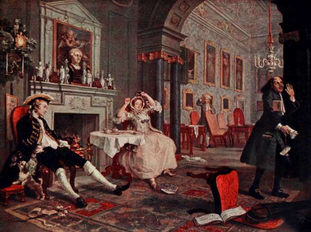 I have kept the most popular of the Hogarth National Gallery pictures to the last—the famous “Marriage à la Mode” series. The detail of this “pictur’d moral” is a source of unending interest and pleasure to an endless procession of visitors. The eighteenth century may have found in the series a “horrible warning” of the consequences that follow profligacy in high life, but I am perfectly sure that no one in the[Pg 63] twentieth century deduces any moral from this melodrama in paint. It is more than that, it is a minute and craftsmanlike record of the rooms and decorative adjuncts of a wealthy and fashionable man’s house in Hogarth’s day, with his manner of living pushed almost to caricature, which was Hogarth’s method of satire and fierce moral rebuke.