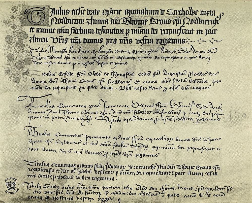 | VI. | Heading of Mortuary Roll, Thomas Brown, Bishop of Norwich, d. 1445 Cott. Charters, ii., 18. |