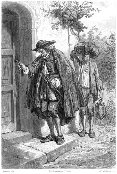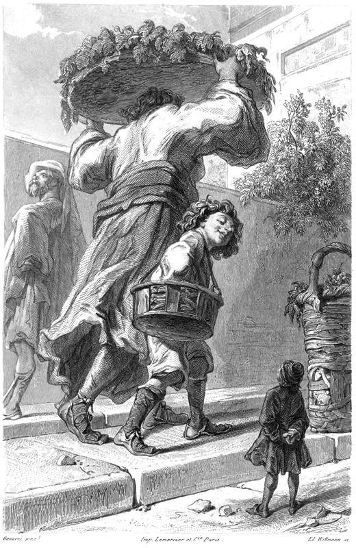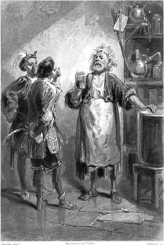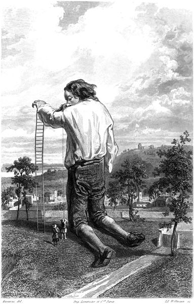 Mon appétit était même si pressant, que je ne pus m'empêcher de témoigner de mon impatience (peut-être contre les règles de la civilité) en portant mon doigt très-souvent à ma bouche, indiquant à ces petites gens que j'avais besoin de nourriture. L'hurgo (c'est ainsi que parmi eux l'on appelle un grand seigneur, comme je l'appris plus tard), m'entendit fort bien. Il descendit de cet échafaudage, ordonnant que plusieurs échelles fussent appliquées à mes côtés; sur ces échelles grimpèrent plus de cent hommes, qui se mirent en marche aux alentours de ma bouche, infiniment chargés de paniers pleins de viandes. Il y avait, dans cette espèce d'olla podrida, de la chair de différents animaux; mais je ne pouvais guère me reconnaître en ces différences. On eût dit un immense abatis d'épaules et d'éclanches semblables à l'épaule et à l'éclanche du mouton, fort bien accommodées, mais plus 36 petites que les ailes d'une alouette; j'en avalais deux ou trois d'une bouchée avec six grands pains de ménage. Ils me fournirent tout cela, témoignant de grandes marques d'étonnement et d'admiration à me voir de si haute taille et d'un si prodigieux appétit. Sur un autre signe en demandant à boire! ils conjecturèrent, par la façon dont je mangeais, qu'une médiocre quantité de boisson ne me suffirait pas, et, très-intelligents qu'ils étaient, ils levèrent avec beaucoup d'adresse un des plus grands tonneaux de vin qui fût dans leurs caves, le roulèrent vers ma main, et le défoncèrent. Je le humai d'un seul coup comme on ferait d'un œuf frais, avec grand plaisir; et bien vite, on m'apporta un autre muid, que je bus de même, en faisant plusieurs signes pour avertir qu'ils eussent à me voiturer encore un peu de boisson.