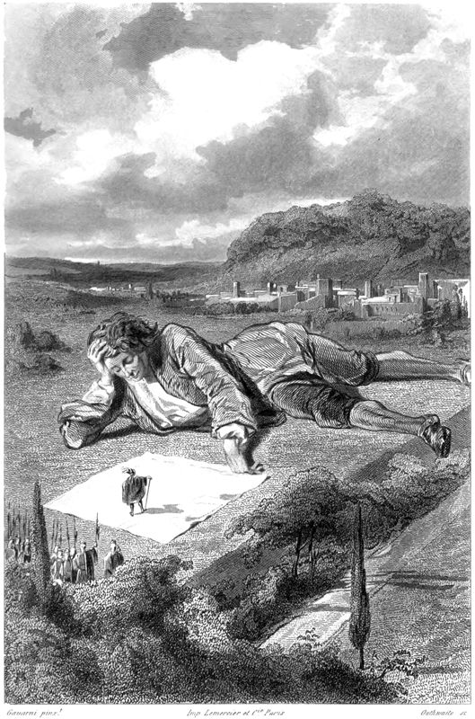 Il y avait quatre heures que nous étions en marche, et l'on ne voyait pas encore les remparts de Lilliput, lorsque je fus subitement réveillé par un accident assez ridicule. Les voituriers s'étant arrêtés pour raccommoder une des roues, deux ou trois habitants du pays avaient eu la curiosité de regarder comment j'étais fait quand je dormais; et s'avançant très-doucement jusqu'à mon visage, l'un d'entre eux, capitaine aux gardes, avait insinué la pointe aiguë de son esponton bien avant dans ma narine gauche. Ainsi chatouillé, 40 soudain je m'éveille, et j'éternue à grand bruit, trois fois de suite. Il fut bien heureux, le capitaine aux gardes, de n'être pas reniflé. Mais enfin, à force d'avancer, nous fîmes une grande marche le reste de ce jour, et nous campâmes la nuit avec cinq cents gardes, les uns porteurs de flambeaux, les autres avec des arcs et des flèches, prêts à tirer à mon premier geste. Le lendemain, au lever du soleil, mon escorte et moi, achevant la route commencée, nous arrivâmes à cent toises des portes de la ville sur le midi. L'empereur et toute sa cour sortirent pour nous voir; mais les grands officiers ne voulurent jamais consentir que Sa Majesté hasardât sa personne sacrée en grimpant sur mon corps, comme plusieurs seigneurs, esprits forts, avaient osé faire.