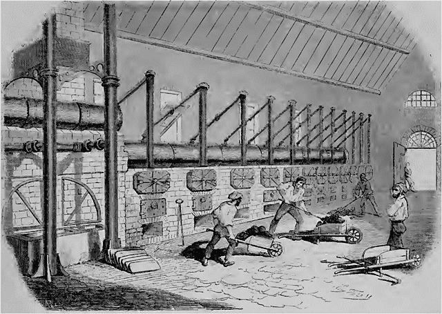 La fabrication du gaz offre, un curieux, un imposant coup d'œil. La compagnie Parisienne, qui est située à la barrière d'Italie, et qui a un des parcours les plus étendus, sinon encore les plus fournis de becs, la compagnie Parisienne a bien voulu admettre nos dessinateurs dans son usine. Leur crayon donnera à nos lecteurs une idée de l'étendue, de l'immensité de ces sortes d'établissements. Mais il lui manquera la couleur pour bien rendre ces fournaises, ce rouge cerise devant lesquels seraient bien pâles les forges de Vulcain à l'Opéra. Cinquante fourneaux, rangés dans l'atelier de distillation, font dégager de la houille ce gaz qui doit se répandre sur Paris en torrents de lumière. Pour retirer le gaz inflammable, la houille est mise dans des cornues continuellement exposées à la chaleur rouge. Cette chaleur leur est communiquée par des fourneaux placés immédiatement au-dessous, ainsi qu'on le voit dans la gravure représentant l'atelier de distillation. Le gaz s'échappant des cornues passe dans un appareil de forme cylindrique et allongé, à travers lequel, après avoir plongé dans l'eau où il dépose les parties bitumineuses qu'il entraînait avec lui, il est dirigé vers l'atelier d'épuration où il circule dans nue foule de tuyaux destinés à le refroidir et où il est mis en contact avec la chaux qui le débarrasse de son hydrogène sulfuré. De là enfin il se rend dans le gazomètre, d'où il ne sort plus que pour la consommation.