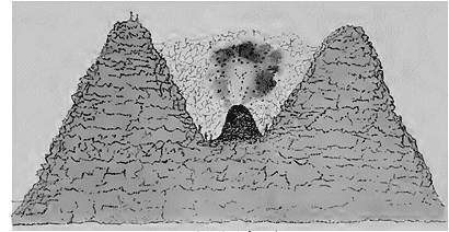 «Supposons une surface plane percée d'un trou. Des pierres sortent de ce trou par jets alternatifs et retombent les unes dans le trou, les autres autour. Ces dernières, s'entassant graduellement, finissent par figurer un cône ou pyramide, dont le conduit central se continue avec le trou d'émission. Vous diriez presque d'un tuyau de cheminée. Telle est, sur une plus grande échelle, la manière dont se forme et s'accroît la pyramide du volcan.