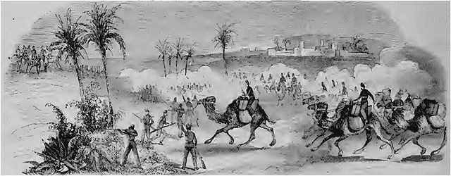 Le dimanche 28 janvier 1811, le maréchal gouverneur-général passait en revue la gendarmerie, l'artillerie et le génie sur le champ de manœuvres de Mustapha, près d'Alger, quand tout à coup des cris sauvages se firent entendre. Aussitôt on vit déboucher par le chemin de la Maison-Carrée, en une masse noire et compacte, un groupe de cavaliers d'une espèce toute nouvelle, élevant dans les airs, du haut de leurs montures africaines, leurs fusils reluisant au soleil; c'était l'escadron de dromadaires. La première vue de cette cavalerie provoqua un mouvement d'hilarité, que le gouverneur-général réprima en s'écriant: «Ne riez pas; la chose est plus sérieuse que vous ne pensez.» En effet, l'escadron de dromadaires exécuta sur-le-champ diverses manœuvres avec une extrême précision, marchant tantôt en colonne, tantôt en bataille, se formant sur la droite, sur la gauche et en avant en bataille, tantôt au pas, tantôt au trot. Bientôt, à un commandement, les hommes sautèrent lestement à terre et se portèrent en avant, exécutant des feux de tirailleurs, tandis qu'un quart d'entre, eux suivaient le mouvement offensif, chaque homme conduisant quatre dromadaires par les rênes.