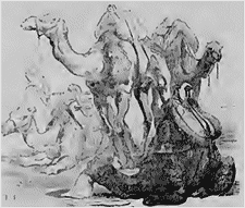 Au mois d'août 1843, M. le chef de bataillon Carluccia, du 33e de ligne, a obtenu, sur sa demande, du gouverneur-général, l'autorisation d'organiser à la Maison-Carrée un escadron de cent dromadaires, avec deux ceins hommes d'élite du 33e de ligne et du 6e bataillon de chasseurs d'Orléans. Il y a ainsi deux hommes pour un dromadaire: un seul monte, un autre conduit; ils se relayent à chaque halte; tous deux peuvent monter au besoin. C'est sur l'arriére du bât que le cavalier est assis; le devant est occupé par les deux sacs des soldats, par deux outres contenant de quatre à cinq litres d'eau chaque, ainsi que par un grand sac en toile renfermant pour un mois de vivres des deux soldats en biscuit, sel, sucre, café et riz.