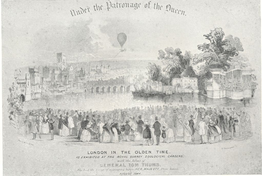 In 1845 De Berenger died, and this year Littlejohn (the refreshment caterer to the gardens) and Tom Matthews managed the place between them. Charles Green, the balloonist, was called in, and began that long series of Cremorne ascents which a spice of eccentricity and danger always rendered popular. For example, in September, Green went up with a lady and a leopard—the latter a magnificent animal, so perfectly subdued in the presence of his mistress or her ‘livery servant,’ as to lay (according to the bill) at her feet or crouch in her lap at command. In August the balloon party consisted of Green, Lord George Beresford, and Tom Matthews, who preluded the ascent by singing his ‘Hot Codlings.’ The balloon went up at seven, and, after visiting the General Post Office and passing over Stamford Hill in perilous proximity to the New River Reservoir, landed its occupants, after a voyage of two hours, cold and shivering, on a marsh at Tottenham.