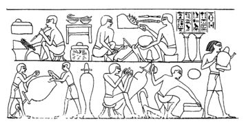 Au point de vue de la civilisation égyptienne, le nombre de documents originaux est considérable. En première ligne doivent être rangés les tableaux que les particuliers, grands seigneurs et fonctionnaires, faisaient sculpter ou peindre sur les murailles des chambres de leurs tombeaux, où étaient représentées en détail les scènes de la vie de tous les jours: ainsi le double du mort, son moi immatériel, qui continuait à vivre comme un esprit impalpable au fond du tombeau, auprès de la momie, pouvait encore jouir en une certaine mesure de la vie de ce monde en contemplant ces scènes familières: les figurations de la vie suffisaient [32] au délassement d’une ombre, de même que la représentation des aliments pouvait assurer éternellement sa subsistance. Des trois grandes époques de l’histoire, l’Ancien Empire memphite, le Moyen et le Nouvel Empire thébain, un grand nombre de ces tombeaux sont parvenus jusqu’à nous, plus ou moins intacts, les mastabas d’abord avec leurs bas-reliefs, puis les hypogées avec leurs peintures. On y voit, en premier lieu une population rurale, occupée à l’élevage des bestiaux aussi bien qu’aux travaux des champs, labourage, semailles, récolte des céréales, vendanges et jardinage; puis de nombreux tableaux de chasse et de pêche, et, à côté de cela, des représentations de gens de métier, potiers, métallurgistes, orfèvres, chaudronniers, menuisiers, charpentiers, maçons sculpteurs, peintres, corroyeurs, cordonniers; un peu plus loin les délassements, musique, danse et jeux, et à certaines époques, des jeux gymniques, des exercices militaires, des scènes de recrutement. Nous possédons de très nombreux exemples de chacune de ces représentations qui souvent sont exécutées avec une délicatesse et un art remarquables et dont les variantes nous permettent de comprendre les scènes dans leurs moindres détails et de reconstituer l’action avec une certitude presque absolue.