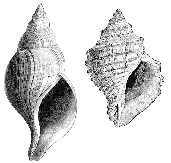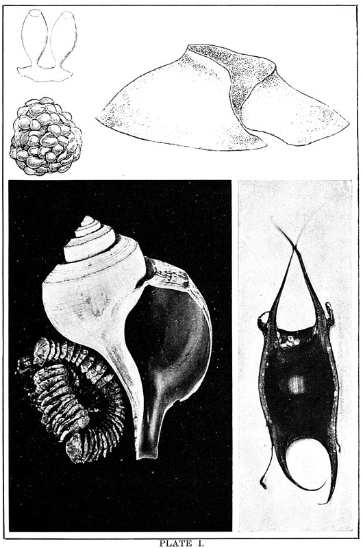 Egg-cases form another class of objects which are often gathered with no idea of their identity. Of these the most common are the long strings of saucer-like capsules which contain the eggs of the mollusk Fulgur, those having square edges being [pg012] the egg-cases of F. carica, and those having sharp edges those of F. canaliculata. Collar-like sandy rings contain the eggs of Polynices (Lunatia), which are cemented together in this shape. The boys of Cape Cod call them "tommy-cod houses." Cylindrical piles of little capsules, sometimes called "ears of corn," hold the eggs of Chrysodomus. The irregular masses of small hemispherical capsules are those of the common whelk (Buccinum). The so-called "Devil's pocket-books" are the egg-cases of the skate.