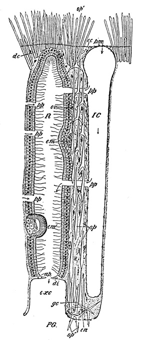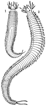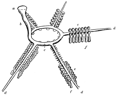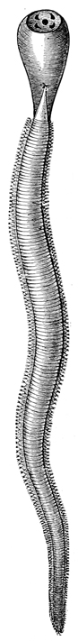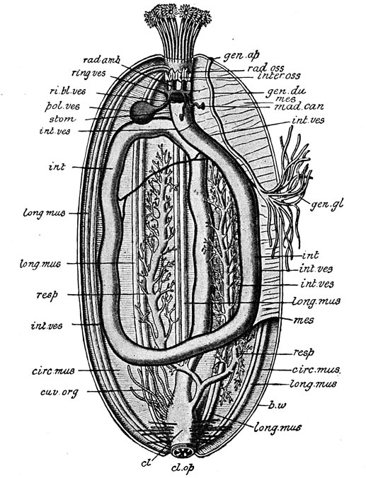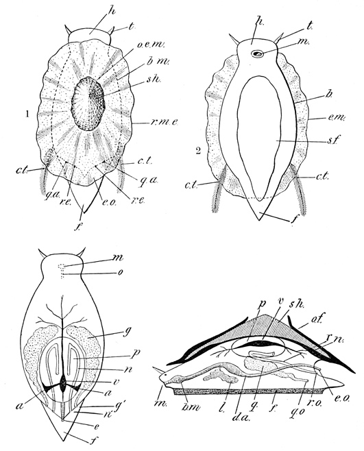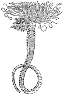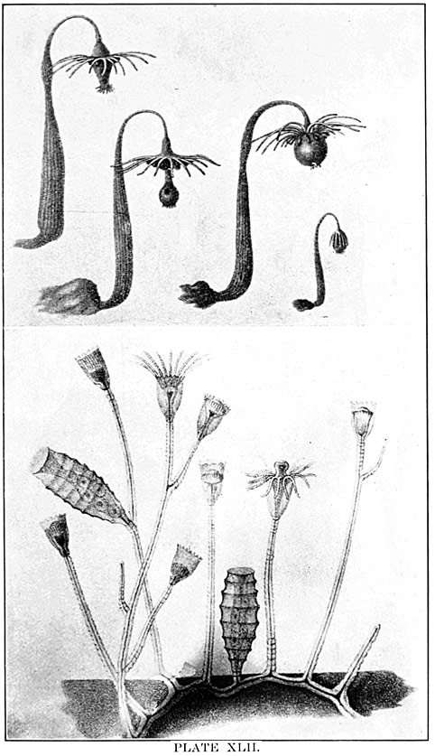 The tunicates are by some authors classed with the vertebrate animals because in the larval stage they have a notochord; this disappears, however, in the adult form, and the animals are considered degenerates. The tunicates are interesting to biologists from the remarkable changes they undergo in their life-history, and (in some genera) the marked phase of alternation of generation. One of their curious anatomical features is the blood-vascular system. The circulation is propelled by wave-like contractions of the heart, which, after forcing the blood one way for a time, stops and reverses the blood-current. The tunicates are widely distributed, and occur at all depths. (Plate LXXXV.) [pg475]