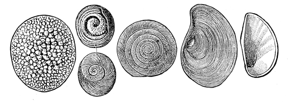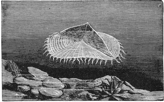 Probably the best-known cephalopod is Nautilus—the pearly-shelled, chambered nautilus made immortal in the beautiful poem of Oliver Wendell Holmes. The shell of Nautilus is a flat spiral; the interior is divided by septa forming a series of chambers; [pg468] the septa are perforated, and through the opening runs a tube or prolongation of the body, the siphuncle, which extends to the tip of the shell. The chambers are filled with gas. The animal in the course of its growth moves forward into a newly formed chamber and builds a new septum, closing the cavity last occupied. Nautilus lives among the coral reefs of the southern Pacific. Its four or five species are the remnants of a once very extensive race of cephalopods. The fossil remains of many species of Nautilus, together with various other genera of shell-bearing cephalopods, indicate that this group has seen its best days. The dibranchiate genera, however, appear to have reached their maximum at the present day.