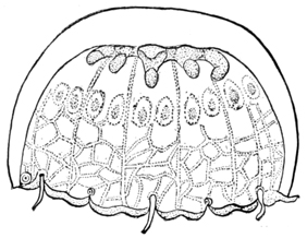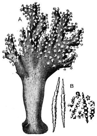 A. pellucidum. A massive compound ascidian, smooth, translucent, and gelatinous, which forms large, hemispherical, complex, irregular masses six inches or more in diameter. It is usually covered by adhering sand. The mass consists of club-shaped lobes, which rise from a common base. Each lobe contains a central orifice around which long, slender zoöids, sometimes an inch long, are grouped. These masses are so abundant in some places that they cover the bottom for considerable spaces. They are found in deep water from Cape Cod to North Carolina. [pg479]