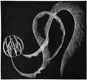 Along the Atlantic coast of the United States, particularly in its northern portion, occur several examples of cephalopods belonging to the genera Ommastrephes and Loligo, all the species of which are referred to, in common parlance, as "squids." They frequent shallow water, and are often to be found in weirs, darting about with rapid, spasmodic movements, or perhaps lying motionless on the bottom. The squids enter the weirs for the purpose of capturing the young mackerel which are caught in these traps. The squid lies quietly upon the bottom, which it simulates so closely in color as to be almost invisible, and when [pg465] a school of fishes swims over it, darts suddenly into the midst of it, seizes a fish with its sucker-bearing arms, and kills it by the bite of its parrot-like beak or jaws. Sometimes it happens that squids, while pursuing fish too near shore, precipitate themselves upon the beach, where they flounder about, ejecting water from their siphons, which pushes them only farther away from the water, and squirting out "ink" from their ink-sacs in a vain endeavor to hide themselves from view. On bright moonlight nights squids often go ashore in vast numbers, and perish within a few inches of their native element, which they seem to be unable to regain. These creatures usually swim backward, and the theory is that, dazzled by the bright light of the moon, they continue to gaze at it while swimming, and if there happens to be a shore in the direction of their movements, they suddenly find themselves beached. The fishermen of Canada and New England take advantage of this habit and capture great quantities of squids by placing bright lights in the bows of their boats and then rowing toward shore, thus driving the squids out of the water. The Banks fishermen use them as bait for catching cod. The right claimed by American fishing-schooners to purchase squids in Newfoundland has helped to keep alive the quarrel between Canadian and American fishermen, which has vexed their respective governments for many years.