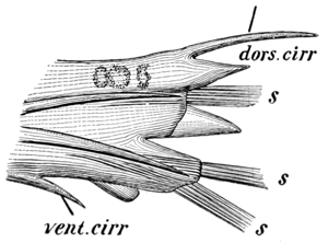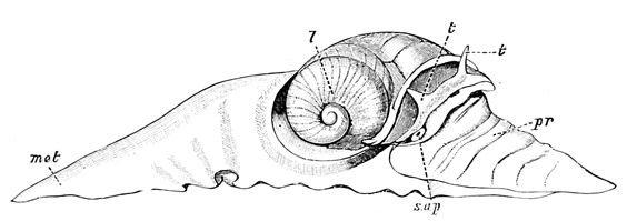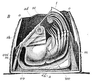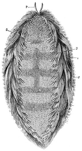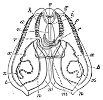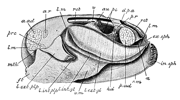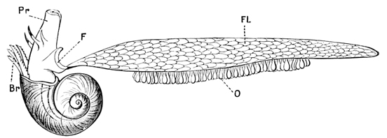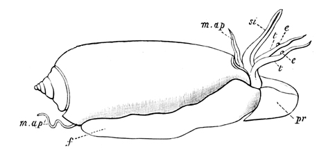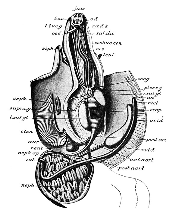The mantle covers the body of the animal, and is a cup-shaped or conical envelope, open only at the anterior end, through which project the head and siphon or funnel. It is attached to the body by a line on the dorsal side, the anterior margin being free and open, but provided with an arrangement of cartilages by which it can be hooked on to the siphon, thus completely closing the entrance to the mantle cavity. The mantle is very muscular, and is constantly expanding and contracting, taking water into the mantle cavity through the mantle opening for respiratory purposes, or expelling it through the siphon for propulsion; in the latter case the mantle opening is closed at the moment of ejecting the water. When the siphon is in its normal position [pg467] the animal swims backward; but it can be turned back over the edge of the mantle, giving a forward movement.