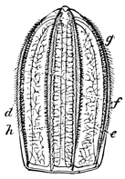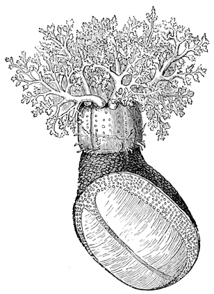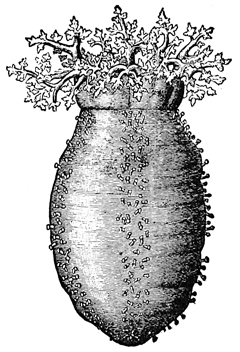 C. pyriformis. Body globular, or oblong when extended; hard, velvety, whitish surface, with pink cheeks; orifices on prominent protuberances on the upper surface. It lives in clear, deep water on rocks, and is sometimes found at low-water mark on the northern New England coast. Commonly called the sea-peach. (Plate LXXXV.)
