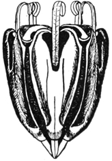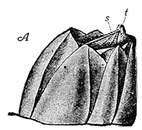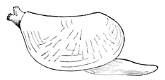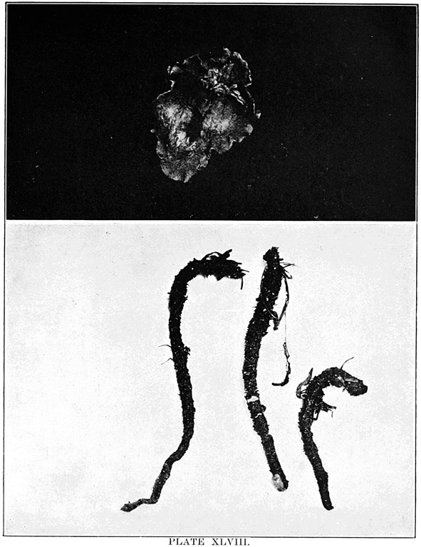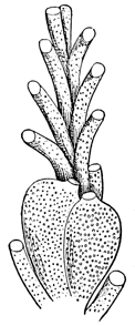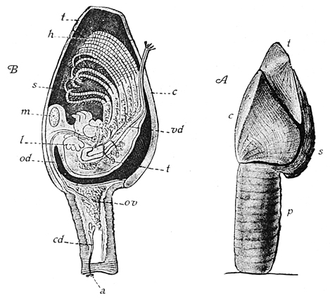 B. clavata. Body long, wrinkled, leathery, on a long stalk, resembling the flower of lady's-slipper (Cypripedium); two cross-shaped orifices wide apart on the side; yellowish in color; attached to stones in deep water, but sometimes washed ashore in storms. The stalks are often covered with polyzoans and hydroids. (Plate LXXXV.)