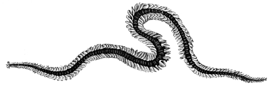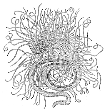 The range in size among the species of this class is very remarkable. The little sepiolas are about an inch long; the squids of our coasts vary in length from eight inches to one foot; and the giant Architeuthis of the North Atlantic measures, often, fifty feet from the end of its arms to the tip of its tail. Such a creature, with its long arms provided with suckers, its powerful jaws, and its rapid, alert movements, is a formidable foe. These animals have been the basis of many legends about sea-serpents and sea-monsters. A gruesome story of an octopus is told by Victor Hugo in "The Toilers of the Sea," where he gives a thrilling account of a man's encounter with a devil-fish in a cave. One who has read this tale has a vivid picture in his mind of the giant squid, and the danger of meeting one of these many-armed foes. Victor Hugo's devil-fish, [pg466] however, is an animal not true to nature, but a composite, having the attributes of the polyp and of the octopus, and the name of a large ray of Southern waters, a real fish, the Cephaloptera, known in its localities as devil-fish. This monstrosity of the novelist's imagination has, however, done more to acquaint the general public with these interesting cephalopods than have the descriptions of scientists.