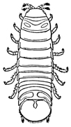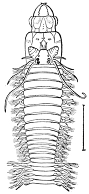 T. navalis. This species is worm-like in form, but it has a small bivalve shell at the larger end, and near the anterior extremity two calcareous appendages called pallets, beyond which extend two siphons. Along the surface of the mantle is secreted a continuous shelly tube which lines the burrow. This mollusk, commonly called the "ship-worm," is exceedingly destructive, perforating with its burrows submerged timber and soon rendering it useless. Various means are taken to protect ships, the piles of wharves, buoys, and the like, against its ravages; copper sheathing, large-headed nails driven close together into the wood, verdigris paint, and so on, being used with more or less effect. Vast numbers of these animals enter the wood and burrow in various directions, but they never interfere with one another, a thin partition of wood always being left between adjacent burrows. How they effect the burrowing is not determined, but it is supposed to be by means of the pallets. Teredo does not, like the boring isopod Limnoria lignorum, feed upon the wood. Its food consists of microscopic organisms which are taken in through the incurrent siphon. In temperate waters T. navalis grows sometimes to the length of six inches; in tropical waters it attains the length of two feet.