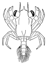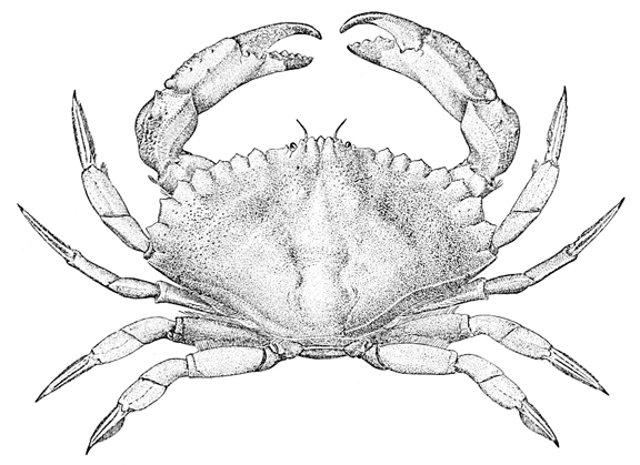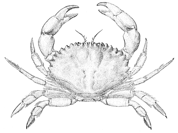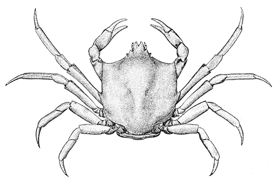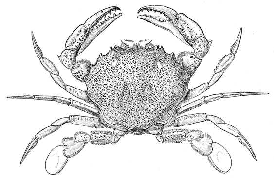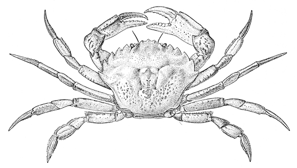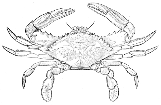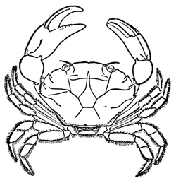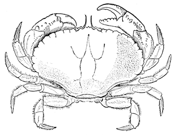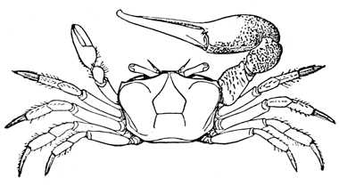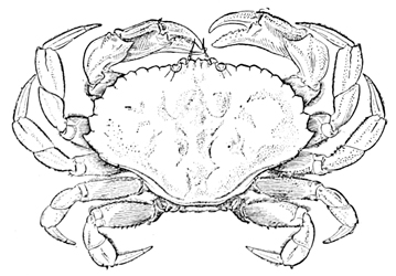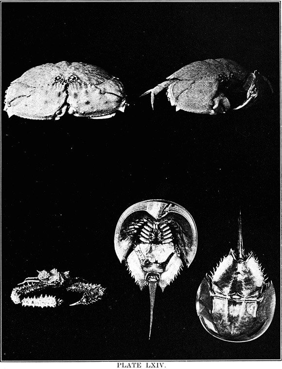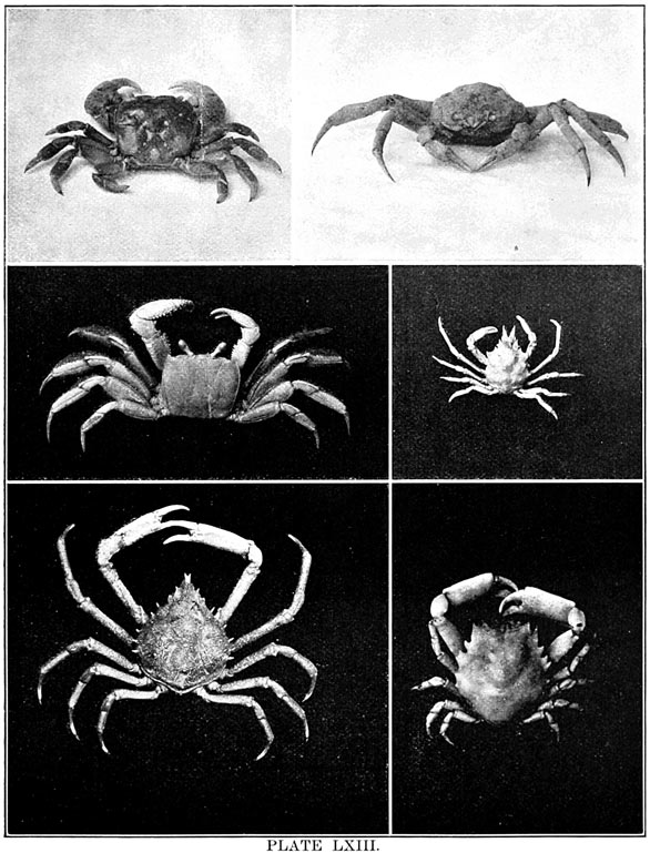There are many varieties of mud-crabs, of which the most common are the "fiddlers," which honeycomb the banks and the surface of salt-marshes with their burrows. The common edible crab Callinectes hastatus is plentiful in bays and estuaries. The sluggish spider-crabs hide beneath the surface of the mud and in decaying weeds and eel-grass. Hermit-crabs are plentiful here as well as elsewhere. Panopeus is a sluggish crab found in shallow water and in all sorts of hiding-places along the shore. It [pg013] may often be found in dead shells, and, in the South, in holes in the banks. This genus is represented by a number of species, some of which are quite pretty.