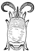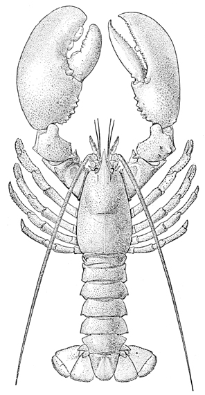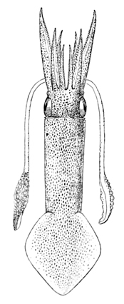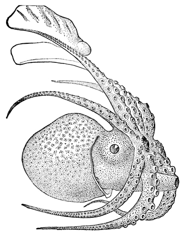 O. illecebrosus. A species similar to L. Pealei, but with shorter fins. These are broad and pear-shaped, one third wider than they are long, and usually reach less than one half the length of the mantle. They are straight on the posterior end, and form nearly a right angle, while the upper margins are rounded. The head is as broad as the mantle. The arms are stout and taper to an acute point. The tentacular arms are long when expanded. The species is abundant from Cape Cod to Newfoundland, and is found as far south as Newport, Rhode Island. This is the squid which is used so extensively in the Banks fishery as bait. It [pg470] visits the shores in large schools, presumably in pursuit of prey, and often itself becomes the victim. It is a beautiful creature from its varying colors, which are truly wonderful. It changes in a moment from vivid red to deep blue, purple, orange, and so on, the colors often passing over it in flashes as it swims along. [pg471]