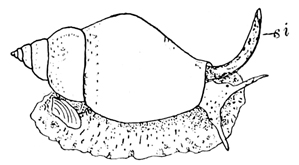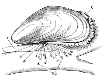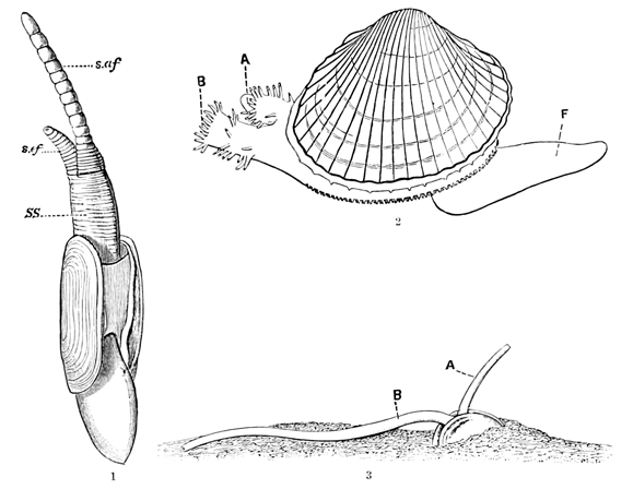 In Pholas the anterior part of the hinge-margin is reflected back over the umbones, and a long rib-like tooth springs from under the umbonal region and curves out almost to the center of the valves. The shell gapes "fore and aft," and is thin, white, very hard, and brittle. The animal has a short, truncated foot and a small orifice in the mantle through which the foot may be projected. The siphons are long and are united almost to their ends. Dorsally, an exposed portion of the animal is protected by accessory calcareous plates. The habits of Pholas are very interesting. It is found in holes gouged out of solid rock or out of pieces of wood; sometimes, like Petricola, it may be found excavating in hard clay. As the anterior end of a Pholas shell is the larger in diameter, and is the end which is most deeply buried in the rock (the opening of the burrow being comparatively small), there was some mystery as to the way in which the creature manages to get inside its rocky dwelling. Observations in aquaria have shown that the young Pholas begins his process of home-building very early in life. The wearing away of the stone is effected by constantly turning the shell around, scraping with the anterior edges of the valves. A lodging-place having been secured, Pholas is obliged to work constantly to enlarge his burrow for the accommodation of his growing shell. The long siphons may project from the hole and draw in food and breath, but the animal is a prisoner for life. When Pholas has withdrawn his long siphons he is reasonably secure from his enemies, but [pg461] nevertheless thousands of them are destroyed by predatory starfishes, who know how to get at their victims. The restless crustaceans, ever on the outlook for a meal, often nip the siphons of the rock-dwellers, and a kind of worm sometimes attacks them, and, destroying the animal, proceeds to occupy the empty shell and burrow.