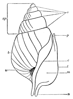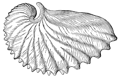 Only Nautilus and the female Argonauta have the characteristic external shell of mollusks. In all other forms the shell is internal or is invested in the integument of the mantle. Of such is the cuttlebone of commerce, which is a calcareous leaf-like body obtained from Sepia, the cuttlefish. The common squid Loligo has a horny substance situated in the dorsal side of the mantle, called the pen. Spirula has a spiral internal shell divided into chambers. Vast numbers of these shells are cast upon the beaches of the Pacific Islands, and they have also been found on the shore of Nantucket.