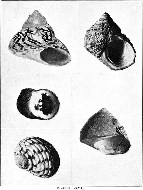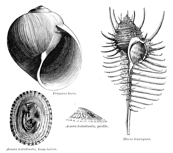 Mollusks, and other classes as well, differ in different latitudes. On the rocks of the Northern shores Littorina and Purpura shells are very abundant, the latter in various colors and beautifully striped. Limpets are also plentiful, but are not as conspicuous, since they have flat, disk-shaped shells. When their capture is attempted, they must be taken unawares and pushed quickly aside, else they take such a firm hold of the rock that it is difficult to dislodge them. Near low-water mark under ledges will perhaps be found chitons, which are easily recognized by their oval, jointed shells. On the California coast in like localities will be found the beautiful Haliotis, Acmæa, and chitons. Every stone that is lifted will disclose numbers of little amphipods (Gammarus), which will scuttle away on their sides to other shelter; worms will suddenly disappear into the mud, and perhaps a crab, here and there, having no alternative, will make a stand and fight for his liberty. Flat against the stone and not easily perceived may be a chiton, a planarian worm, or a nudibranch. And just below the water's edge are sea-urchins and starfishes, which grow in numbers as the eye becomes accustomed to the search.
