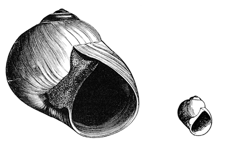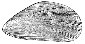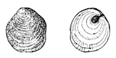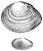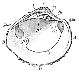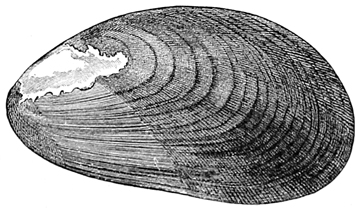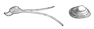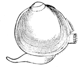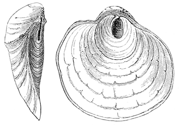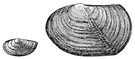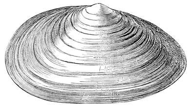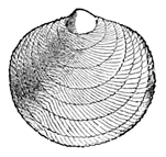 P. trilineata. A little New England shell, remarkable on account of its extreme flatness. When looking at this shell before opening it, one naturally wonders where the animal finds room to exist between two such disk-like valves. The animal is very thin, with largely united mantle-edges, widely separated feeble adductor muscles, and a fairly large tongue-shaped foot. The shell is nacreous, rounded anteriorly, and produced posteriorly into a sort of upturned tip which gapes to accommodate two little siphons. The dorsal hinge-margin is excavated and curved. Length about one inch. It is abundant at Cape Cod, in sandy stations, on oyster-beds, and is found from Maine to Florida. [pg464]