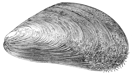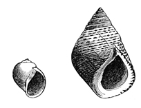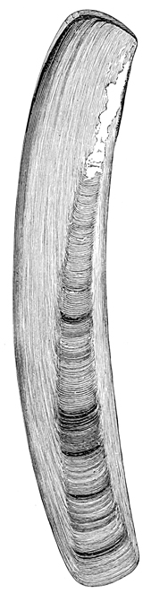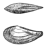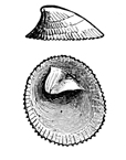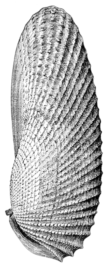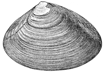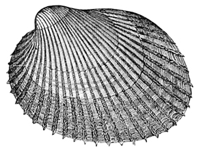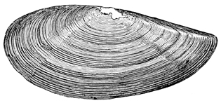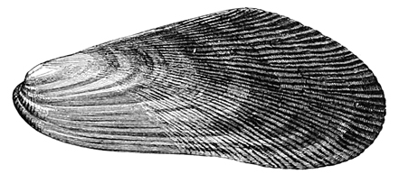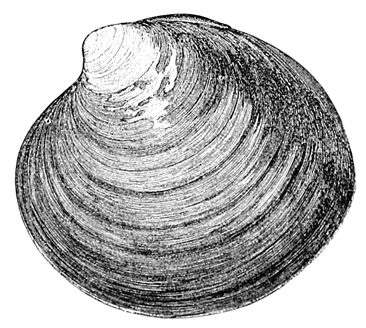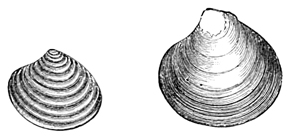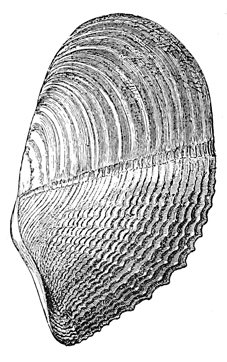 Z. crispata. A species of Northern range, occurring but sparingly in New England, in hard clay or rocky burrows. It may be identified at once by the furrow which passes from the beaks across the valves to the lower edges of the shell and divides the surface of the valve into two areas. The anterior area is decorated with radiating toothed ribs; the posterior area is smooth. This conchological feature of the genus is very [pg462] curious; it may be observed also in several deep-sea genera and in certain extinct fossil forms. The length of this shell is about two inches. This species also occurs in California, where its favorite station is in hard tenacious clay. Length two to four inches.