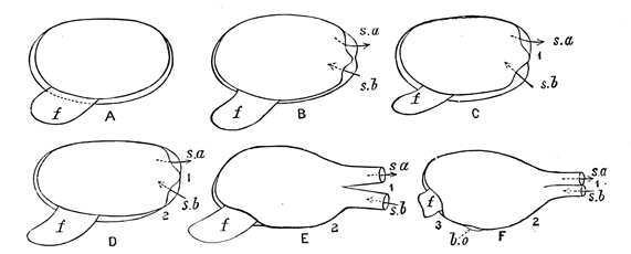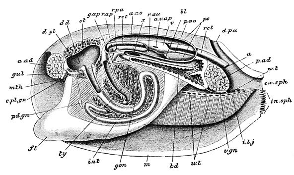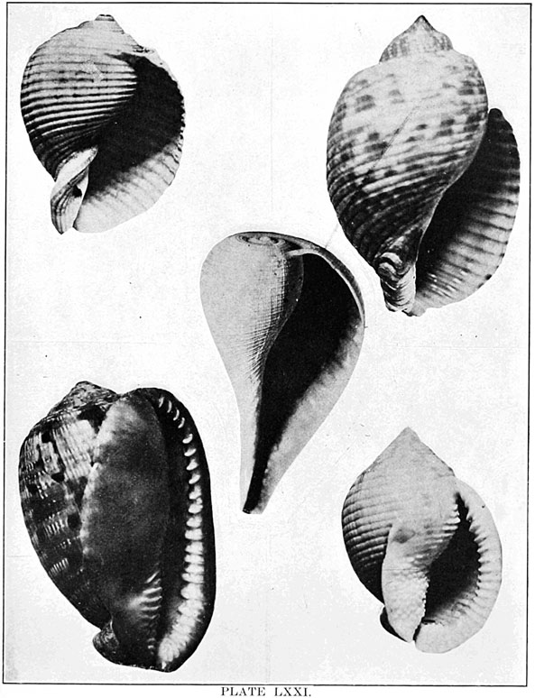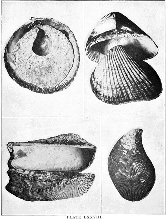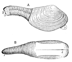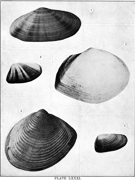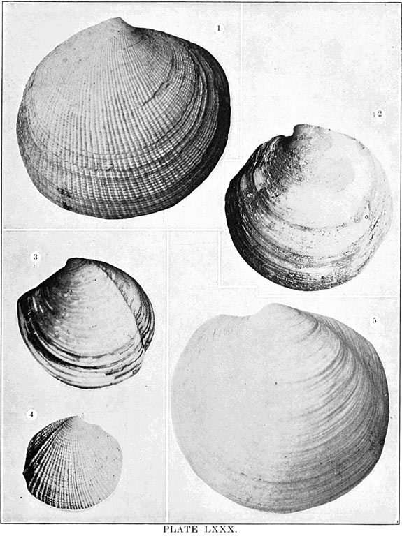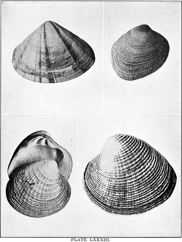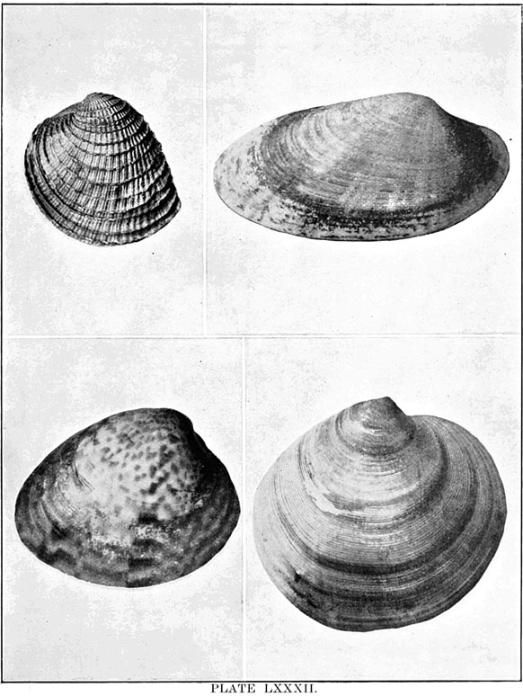 G. generosa. A large shell of the Pacific coast, occurring most abundantly in Puget Sound waters, where it frequents muddy shallows. It is a remarkable pelecypod in respect to its siphons and the degree of mantle fusion. The appearance of the animal is that of a huge pair of [pg460] united siphons, protected laterally at their larger end by two white, widely gaping valves. The very small pedal opening in the line or mantle juncture indicates a very small foot. (Plate LXXXIV.)