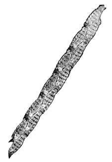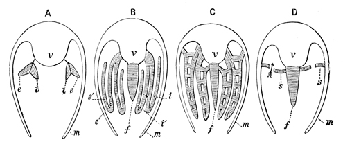The animals of this genus are transparent, subcylindrical, smooth, gelatinous bodies encircled by bands of white muscular fiber. They strikingly exemplify alternation of generations. They occur in two distinct conditions, one being solitary, the other consisting of animals united in chains. The solitary individuals are about an inch long, and have two long processes at the posterior end. These single animals reproduce by budding, and form series of individuals in small chains, the animals being arranged in two rows. The chains grow to the length of a foot or more, and contain twenty to thirty pairs of salpas. Each of these connected individuals produces in turn a single egg, which becomes a single Salpa, and this again, like its grandmother, reproduces by budding. Thus the animals are alike only in alternate generations. The naturalist Chamisso, who discovered the relationship between the two forms, expressed it as follows: a Salpa mother is not like its daughter or its mother, but resembles its sister, its grandmother, and its granddaughter. The single zoöids liberate many colonies during the summer, which grow rapidly, and in the autumn the chains are exceedingly abundant. The Salpa chains swim about with a serpentine movement, and are beautiful, delicate objects with their transparent bodies banded with white, tinged with pink, and streaked with blue.