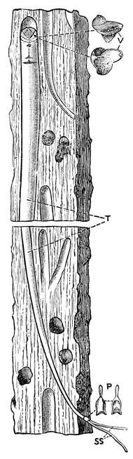There are three other species of Teredo and one of the genus Xylotrya on our Northern shores; T. navalis is, however, the most common and most destructive. In Southern waters there are many other forms of these boring mollusks. [pg463]