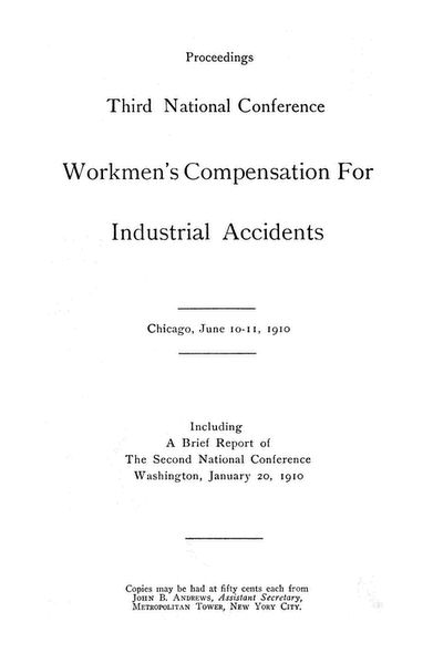The National Conference on Workmen's Compensation for Industrial Accidents was organized at Atlantic City, July 29-31, 1909. The second meeting was held in Washington, January 20, 1910. The third meeting, June 10-11, 1910, was in Chicago. The nature of the Conference is clearly set forth as follows: