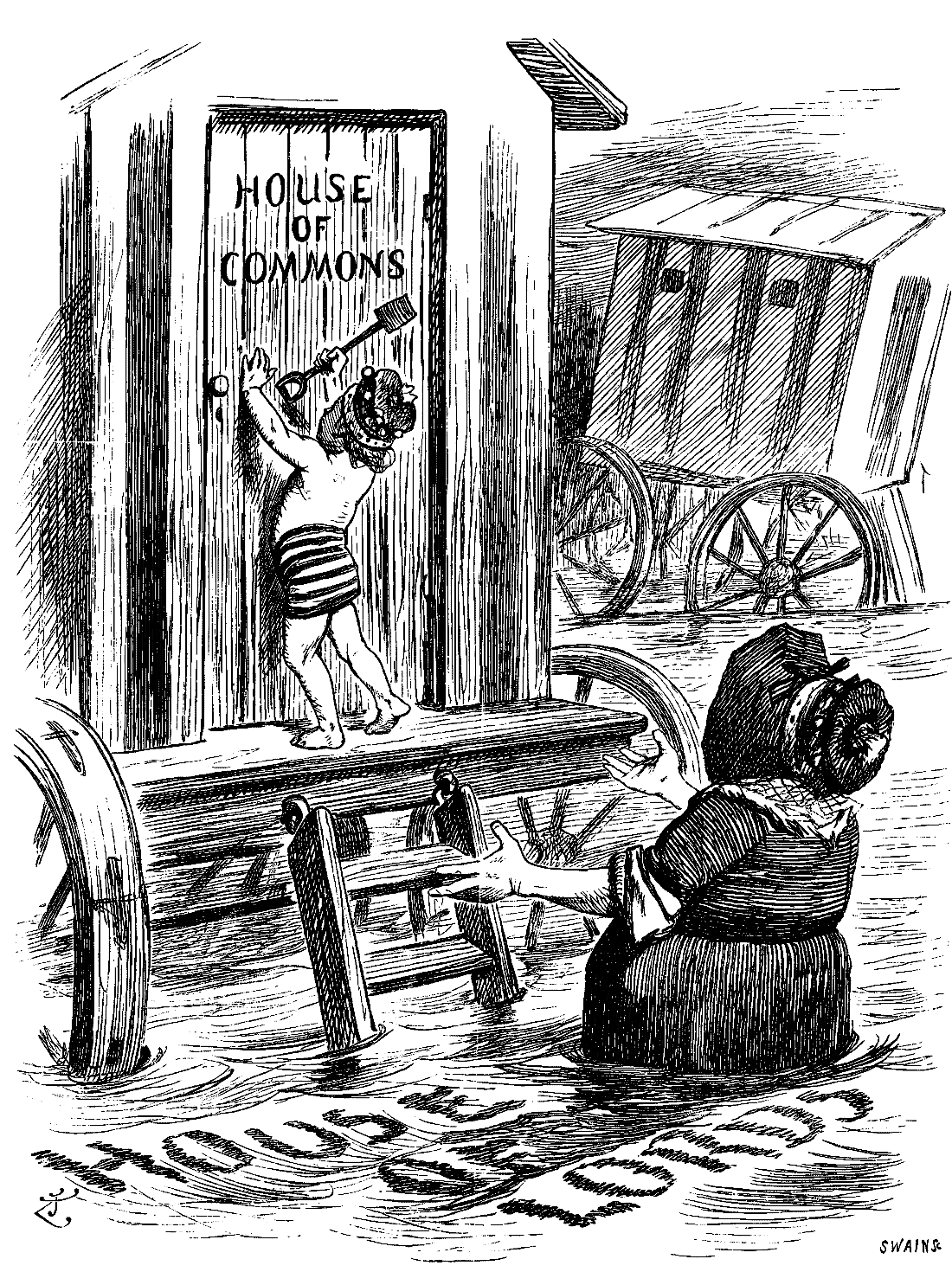 At preconcerted signal Brodrick rapidly entered; bustled down to Front Opposition Bench. Attention of Members thus attracted, the Pirate Peer followed, strode with firm step down House. "Just as if he were walking the plank," said Donald Currie, looking on admiringly. Before House knew what had happened, there he sat, smiling and blushing, between those pillars of Law and Order, Joe and Courtney. Never since Parliaments began had British Constitution received such a staggering blow. Sage of Queen Anne's Gate, whilst anxious to see destruction of House of Lords, is not disposed to have stray fragments incorporated with fabric of Commons. Called Speaker's attention to presence in their midst of the Pirate Peer. Asked what they were going to do with him?