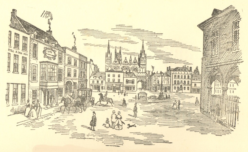 That is the history of gas in Peterborough. This brings us back to the Long Causeway and the Market Place. Not the market now, as I recollect it! Up to the year 1848 the farmers attending the market used to p. 33cool their heels in the open air in front of the Town Hall, hot or cold, wet or dry, rain or snow, blowing or still, there they stood, till the Theatre, now the Corn Exchange (since largely added to), became vacant, and it occurred to some agricultural gentleman that they could be much more comfortable in every way if they could form a company, and they did so, and I think no one will doubt that is an improvement. On the Long Causeway, the Cattle Market was the principal institution of the place, and I will tell you why. On Saturdays that place was wholly given up to them. There they were; nobody paid anything; anybody who had cows or horses to sell brought them there. They became the proprietors of the street for that day.