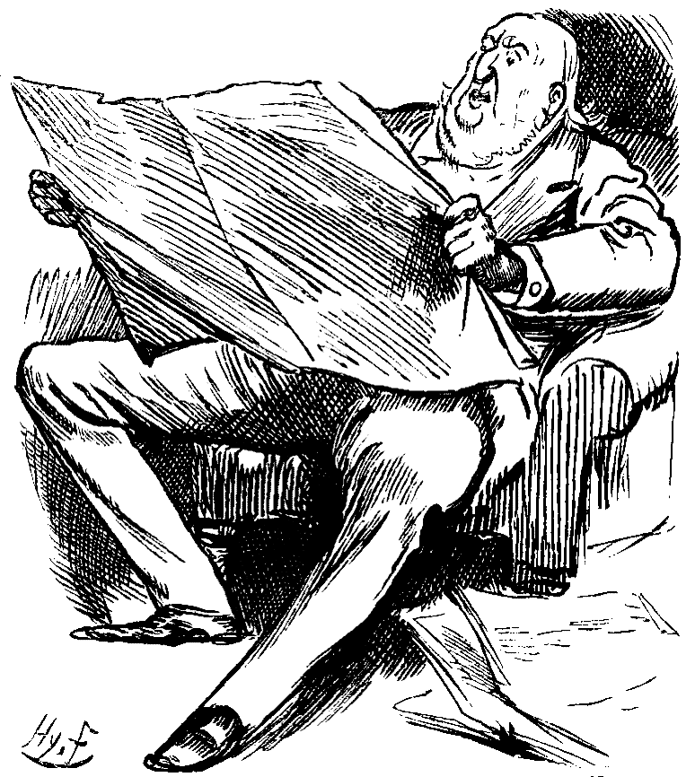 Scene—Breakfast-table of an Illustrious Statesman of stalwart proportions and "Gladstonian" politics. Illustrious Statesman discovered, admiringly perusing three closely-printed columns of leading Morning Paper.