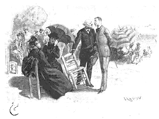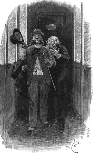 Quand le coup de la demie frappa, il ouvrit la porte de son cabinet, et apparut coiffé d'un chapeau rond, portant sur le bras un pardessus dont la boutonnière était décorée d'une rosette multicolore, sa canne à la main; un client misérablement vêtu le suivait et le suppliait.