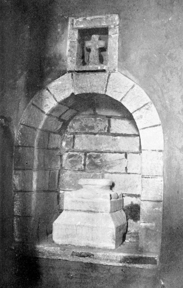 The chancel wall one day sounded hollow when struck; the mortar was removed, and underneath there appeared an arched aperture, which had been filled up with jumbled carved work and a crushed drain. It was cleared out, and so rebuilt as to occupy the exact site of its former existence. It is of the very earliest type of Christian architecture, and, for aught we know, it may be the oldest piscina in all the land. At all events, it can[12] scarcely have seen less than a thousand years. It perpetuates the original form of this appanage of the chancel; for the horn of the Hebrew altar,[14] as is well known to architectural students, was in shape and in usage the primary type of the Christian piscina. These horns were four, one at each corner, and in outline like the crest of a dwarf pillar, with a cup-shaped mouth and a grooved throat, to receive and to carry down the superfluous blood and water of the sacrifices into a cistern or channel underneath. Hence was derived the ecclesiastical custom that, whenever the chalice or other vessel had been rinsed, the water was reverently poured into the piscina, which was usually built into a carved niche of the southward chancel wall. Such is the remarkable relic of former times which still exists in Morwenstow church, verifying, by the unique and remote antiquity of its pillared form, its own primeval origin.