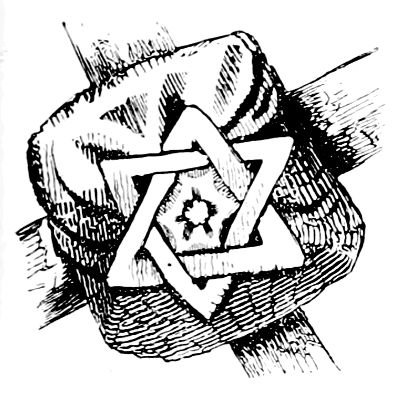 But very remarkable, in the mid-roof, is the[14] boss of the pentacle[16] of Solomon. This was the five-angled figure which was engraven on an emerald, and wherewith he ruled the demons;[17] for they were the vassals of his mighty seal: the five angles in their original mythicism, embracing as they did the unutterable name, meant, it may be, the fingers of Omnipotence as the symbolic Hand subsequently came forth in shadows on Belshazzar’s wall. Be this as it may, it was the concurrent belief of the Eastern nations that the sigil of the Wise King was the source and instrument of his supernatural power. So Heber writes in his “Palestine”—