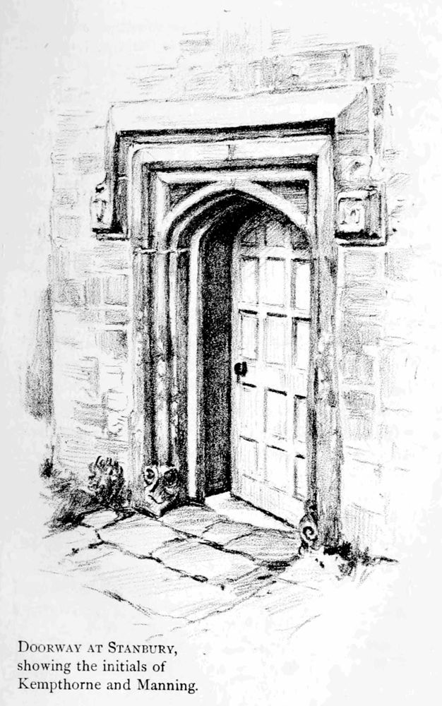Halfway down the principal pathway of the churchyard is a granite altar-tomb. It was raised, in all likelihood, for the old “month’s mind,” or “year’s mind,” of the dead: and it records a sad parochial history of the former time. It was about the middle of the sixteenth century that John Manning, a large landowner of Morwenstow, wooed and won Christiana Kempthorne, the vicar’s daughter. Her father was also a wealthy landlord of the parish in that day. Their marriage united in their own hands a broad estate, and in the midst of it the bridegroom built for his bride the manor-house of Stanbury, and labelled the door-heads and the hearths with the blended initials[29] of the married pair. It was a great and a joyous day when they were wed, and the bride[24] was led home amid all the solemn and festal observances of the time. There were liturgical benedictions of the mansion-house, the hearth, and the marriage-bed; for a large estate and a high place for their future lineage had been blended in the twain. Five months afterwards, on his homeward way from the hunting-field, John Manning was assailed by a mad bull, and gored to death not far from his home. His bride, maddened at the sight of her husband’s corpse, became prematurely a mother and died. They were laid, side by side, with their buried joys and blighted hopes, underneath this altar-tomb—whereon the simple legend records that there lie “John Manning and Christiana his wife, who died A.D. 1546, without living issue.”