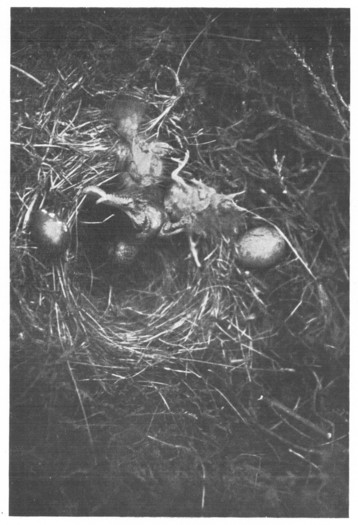 Through the slowly lengthening days of February the two eagles, while hunting independently, worked together to restore the nest on the rock. It was a very big and rough affair, six feet across at the base, built of sticks taken from the Scotch fir and the larch and the thick twigs of heather. Inside it was soft with grass and fern and mosses, and when it was complete the mother eagle laid three eggs, each three inches long and nearly as big round the broader end. They were purple, with red-brown blotches and streaks of yellow and black. It was March before the first egg was laid, and as the other two came at intervals of several days, the first nestling came before the other eggs were hatched. He was an ugly little fellow with big mouth, staring eyes, and grey down in place of feathers.