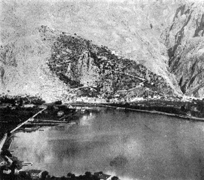 Wir fahren, an Savina vorbei, einem uralten Kloster, das jetzt eine Art von serbischem Ober Sankt Veit ist, die Sommerresidenz des orthodoxen Bischofs von Cattaro, durch die Enge von Kombur in die behaglich ausgedehnte Bai von Tivat. Schon zeigt sich der Lovcen, der Berg von Montenegro. Vor uns aber sieht eine große Straße her, die sich langsam in die Berge windet, oben von zwei Forts bewacht, das ist der Weg in die Krivosije, zu den wilden Hirten mit den Opanken, den kurzen Hosen und dem braunen Tuch über dem rauhen Hemd, die, der Tracht und dem Sinn nach, unsere Schotten sind. Und, an Perasto vorüber, wo man sich, vor dem schlanken Campanile und gebräunten, in Verfall prunkenden Palästen, wirklich im Canal grande glaubt, sind wir in den Golf von Cattaro gelangt. Immer enger wird der See, immer häuslicher das Ufer, mit Dörfern überall, an grünen Höhen, vor uns aber droht die steile Wüste des montenegrinischen Gebirgs, mit dem verwegen in steilen Zacken zum Schnee klimmenden Weg.