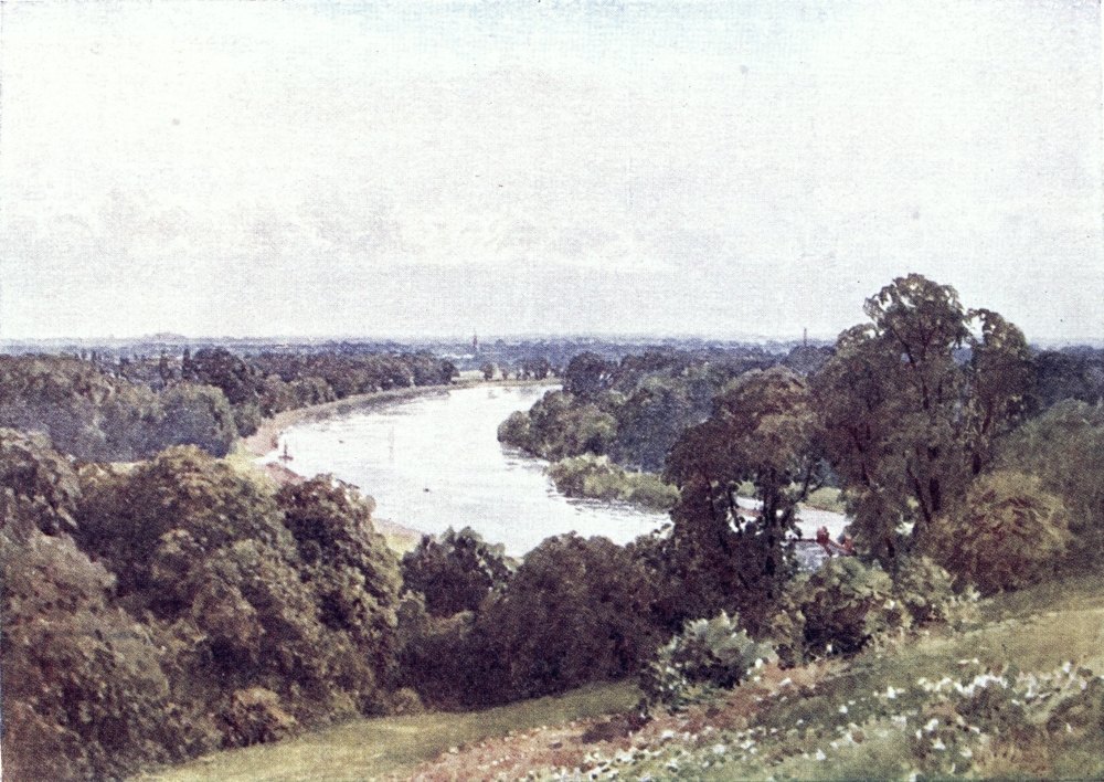 These lines, in which let no writer scorn to join chorus of quotation, are from Denham’s Cooper’s Hill, a title supplied by the “airy mountain” that raises its “proud head”—to a poetic height of 200 feet and more—upon the north-western corner of Surrey. Descending the river from Windsor, after passing Old Windsor Church, we enter this county beyond the “Bells of Ouseley,” to find the right bank edged by what plain prose must belittle as{23} a wooded rise, on whose top, pleasant rather than proud, stands a stately mansion that, in the course of its chequered history, grew into a banyan grove of buildings built in vain. Cooper’s Hill was in Victorian times the property of one of those meteoric financiers flashing across the sky of British commerce, the same who in London built for himself a house so large that no one ever lived in it. Then the place made itself a new name as a college for the Indian engineering service; but this institution came to be uprooted, and its halls passed into private occupation, after for a time standing desolate, as those of Ossian’s Balclutha, while there was question what to do with them. An academy for horse-marines, a week-end club for members of Parliament, a training-school for county councillors, are suggestions that could be made; but, to my mind, a truly Liberal Government might have endowed Cooper’s Hill as an asylum for minor poets.
