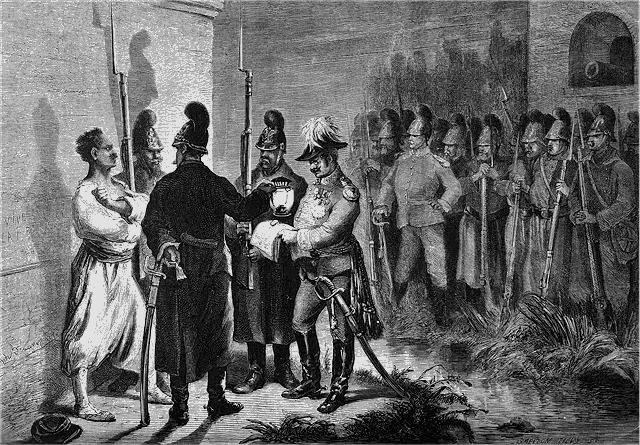 A huit heures, le commandant en chef de l'armée d'occupation arriva à cheval, suivi de son état-major. Après avoir passé dans les rangs, il se plaça devant les troupes. Brusquement il tira son sabre du fourreau, et poussa trois hourrahs auxquels les troupes répondirent.