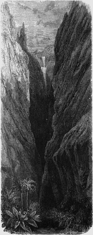 A mesure qu'elles s'éloignent du rivage, ces deux rangées d'édifices se rapprochent et se resserrent; au fond de la vallée, quelque cinquante mètres seulement les sépare, et le soleil pénètre à peine dans ces profondeurs. De nombreuses cascades y dégringolent en pluie perpétuelle et l'humidité y développe une étonnante végétation.