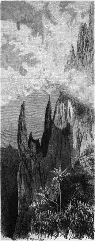 Cette nature est d'une étrangeté saisissante; des mornes à pic surplombent les forêts, hérissés de pointes aiguës; on est là comme aux pieds de cathédrales fantastiques, dont les flèches accrochent les nuages au passage.